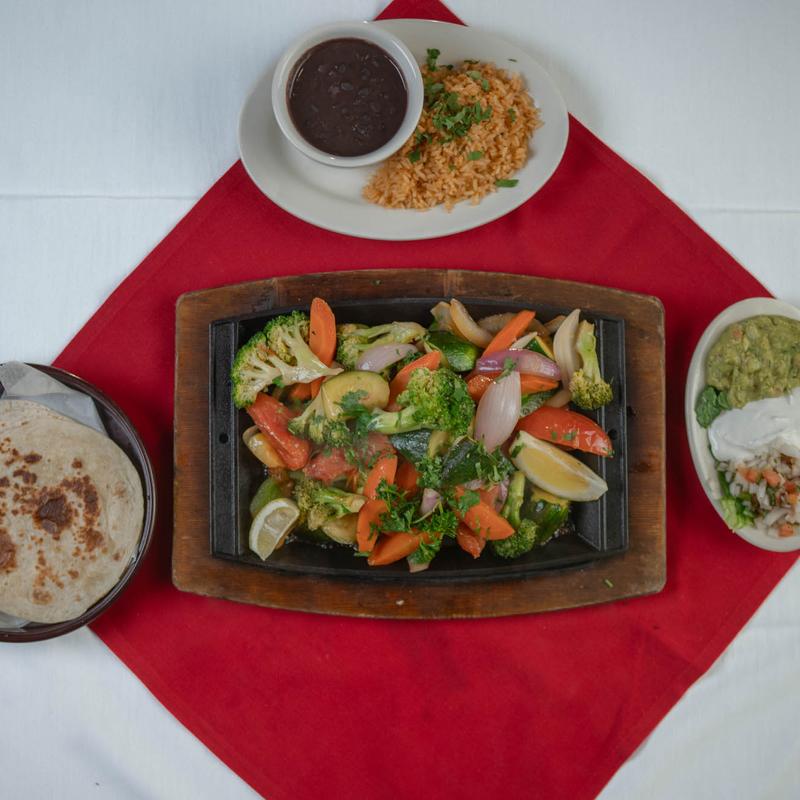 Fajita with zucchini, onions, green peppers, red peppers, broccoli, mushrooms, carrots and celery, served with rice, beans, sour cream, pico de gallo and guacamole