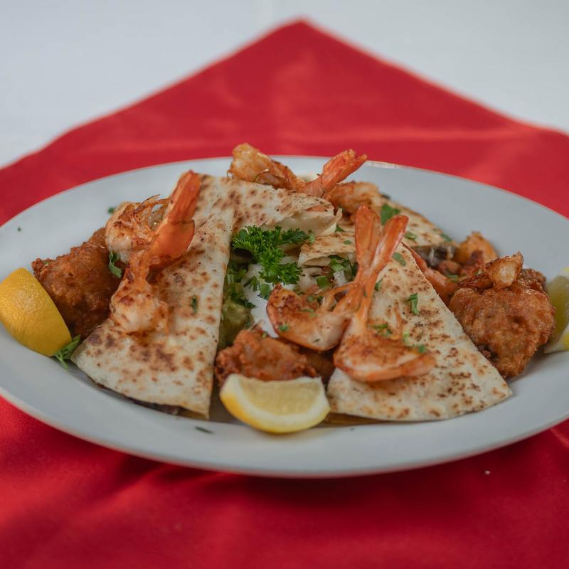 A flour tortilla filled with melted cheese, shrimps, crab meat, served with pico de gallo, guacamole and sour crea
