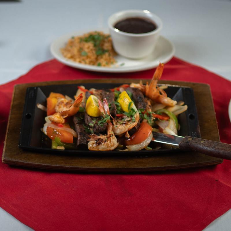 Beef, chicken and shrimp fajitas served with pico de gallo and guacamole